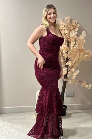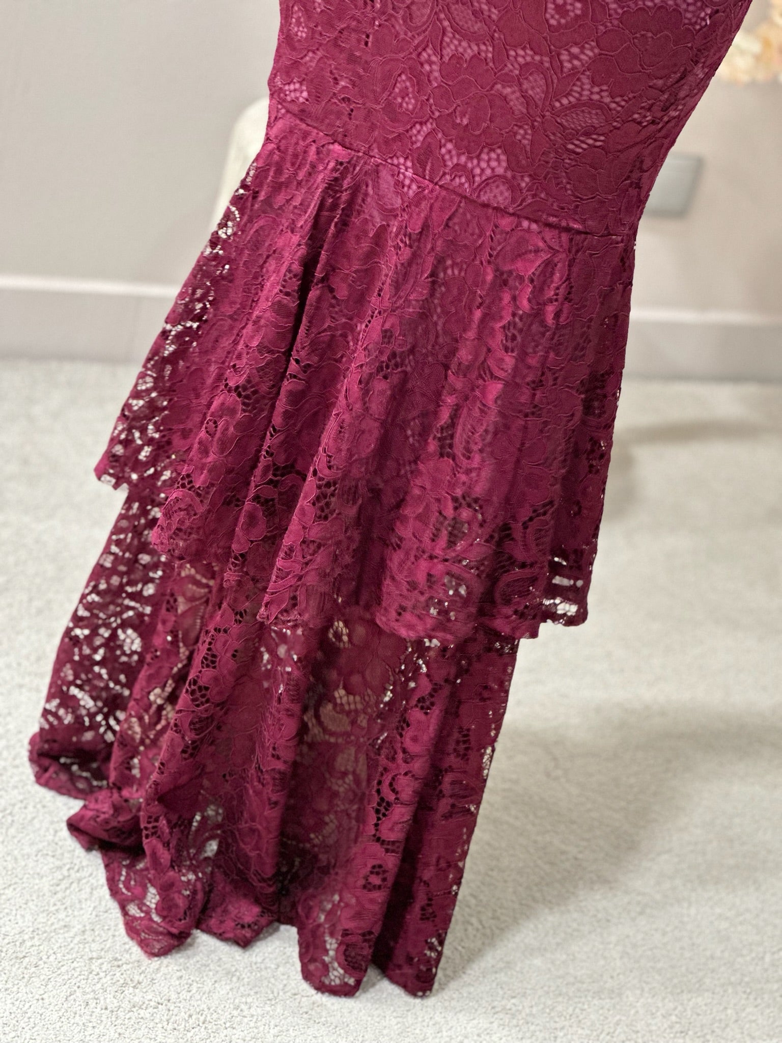 Vestido Cerimónia plissado, acetinado, com abertura de lado.