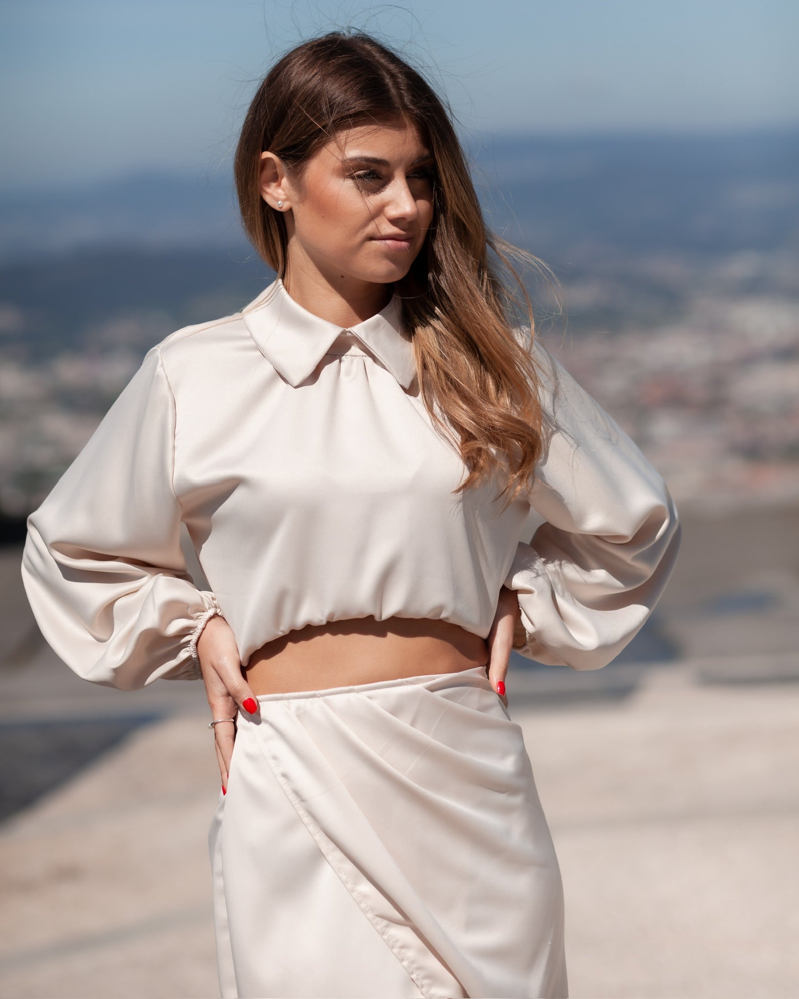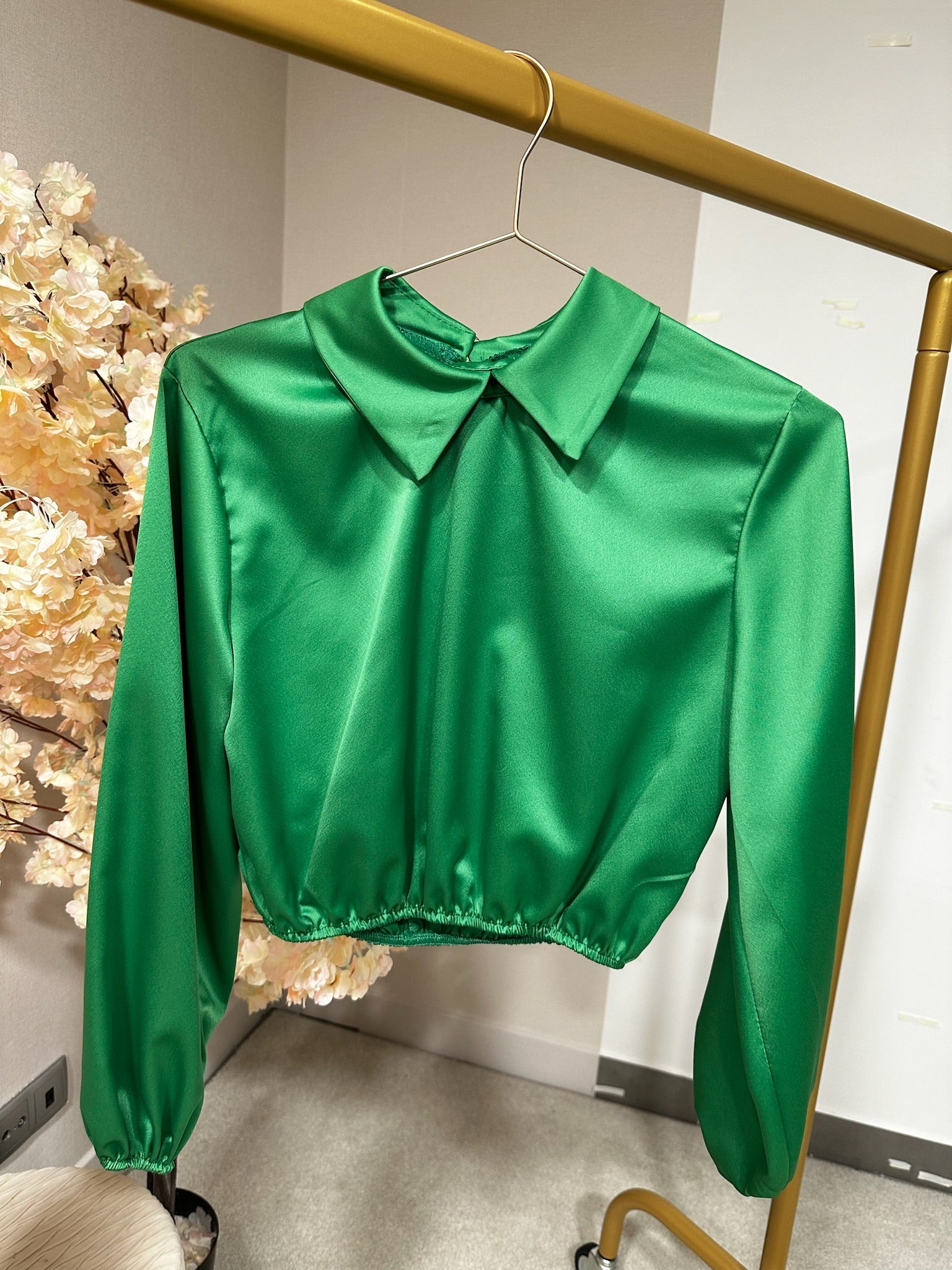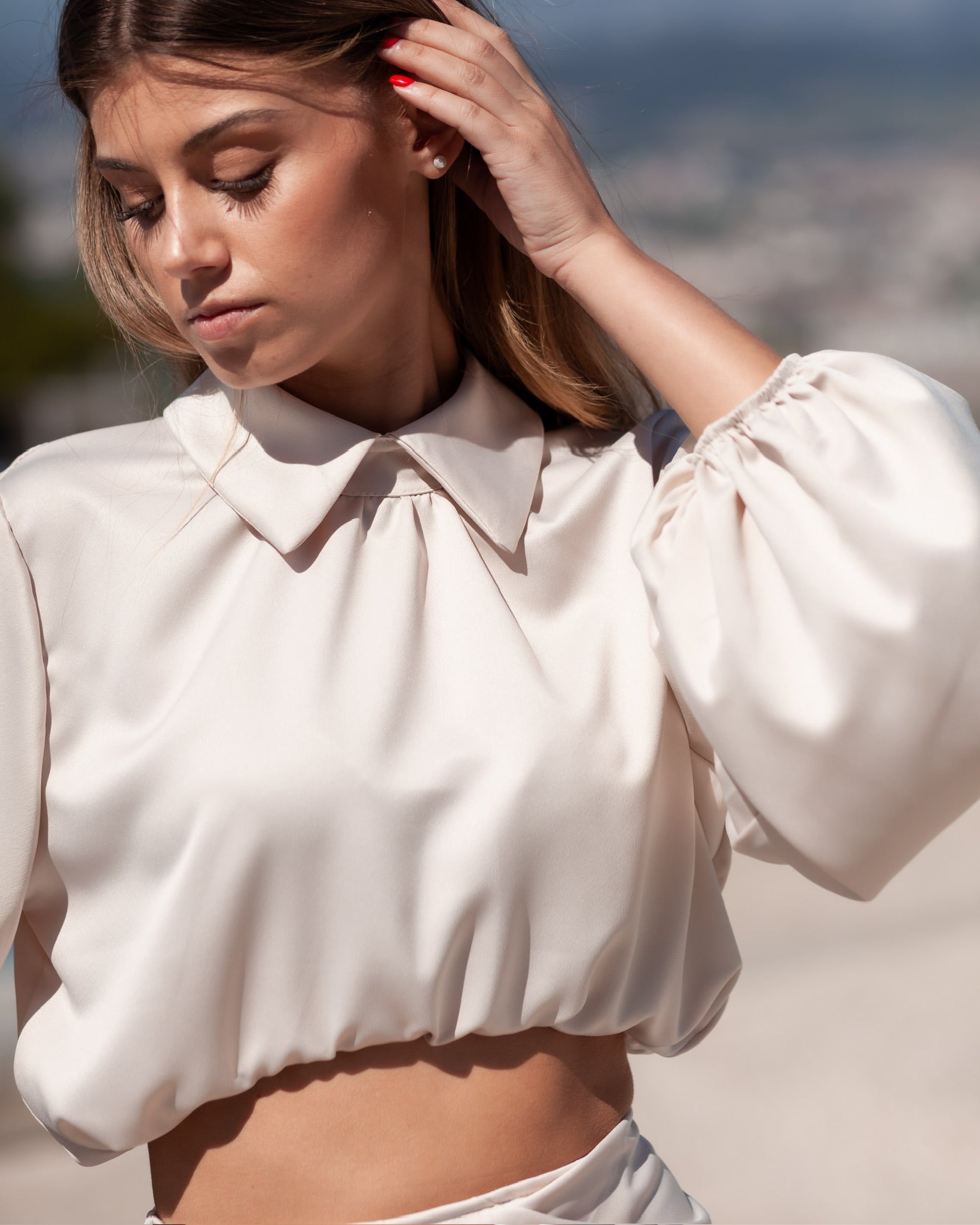 Blusa Cetim curta, com manga comprida.