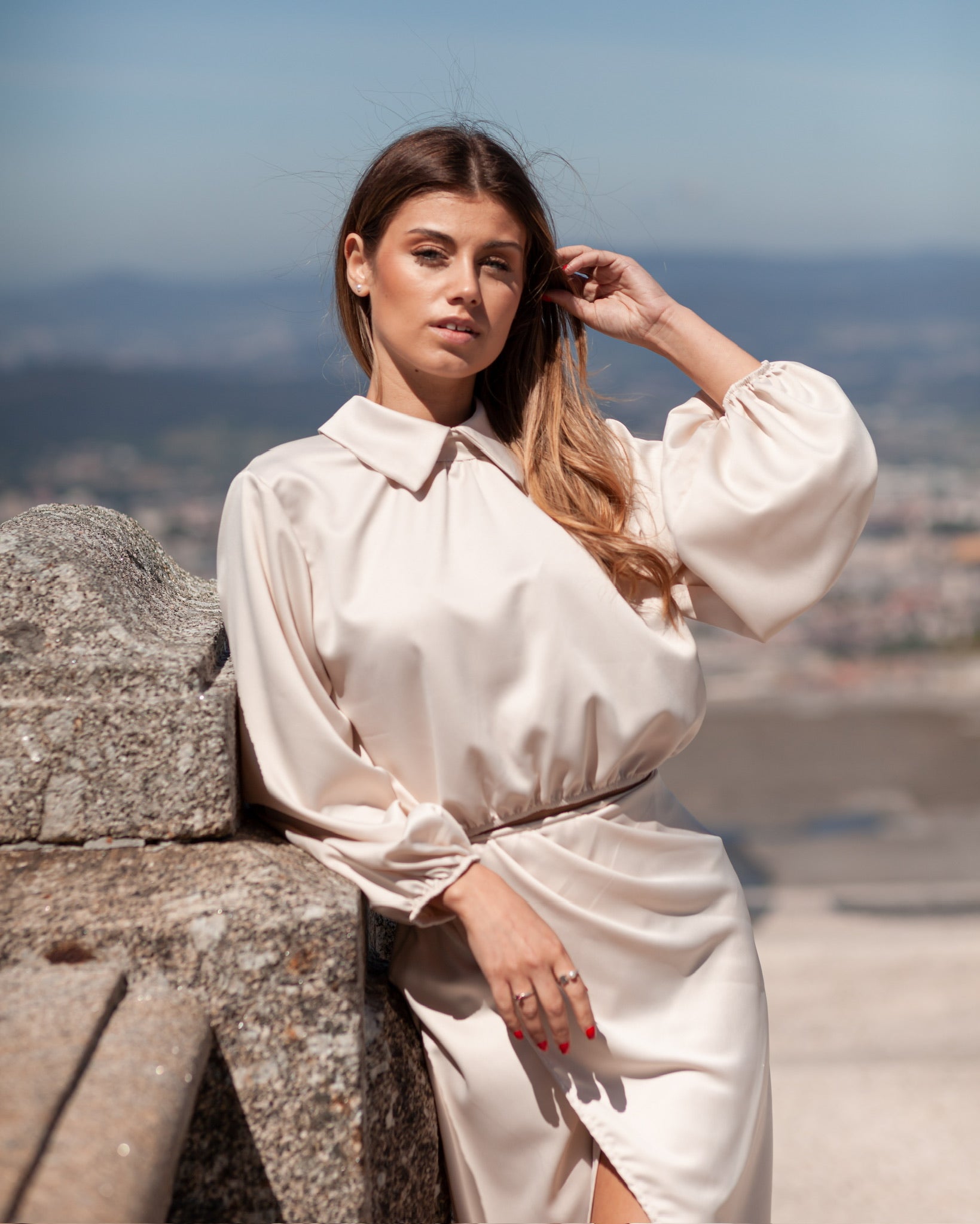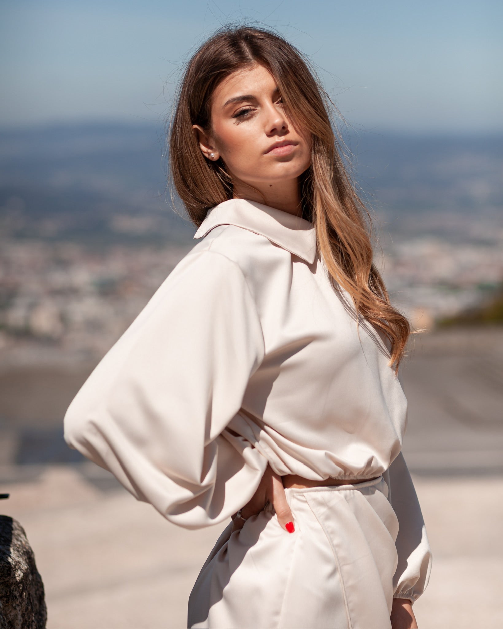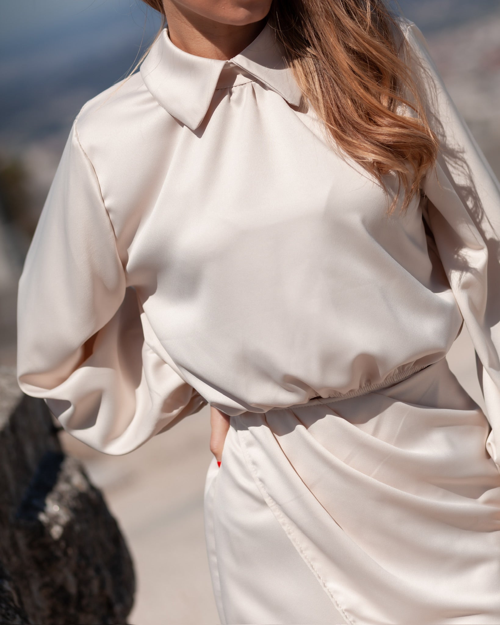 Blusa Cetim curta, com manga comprida.