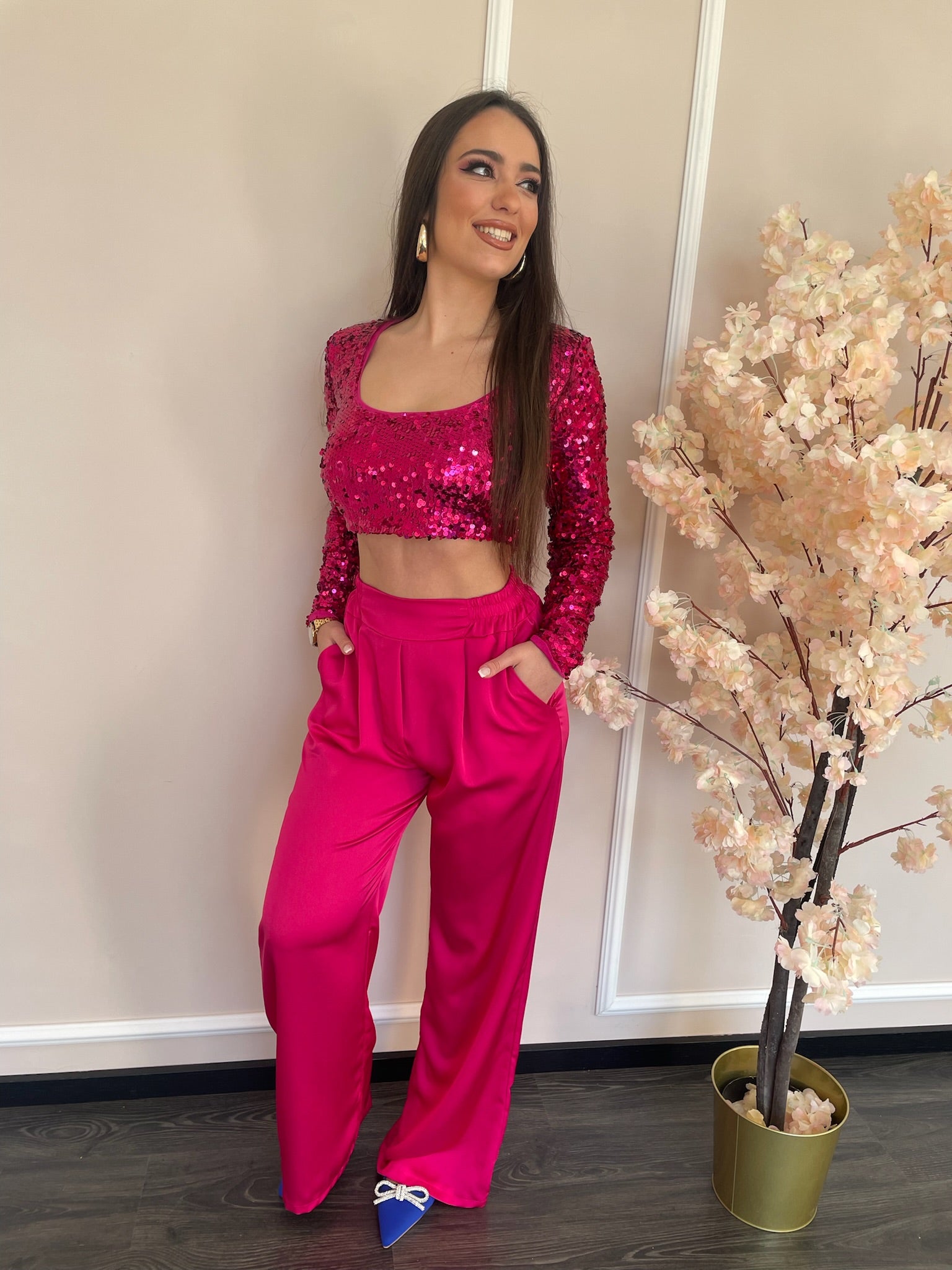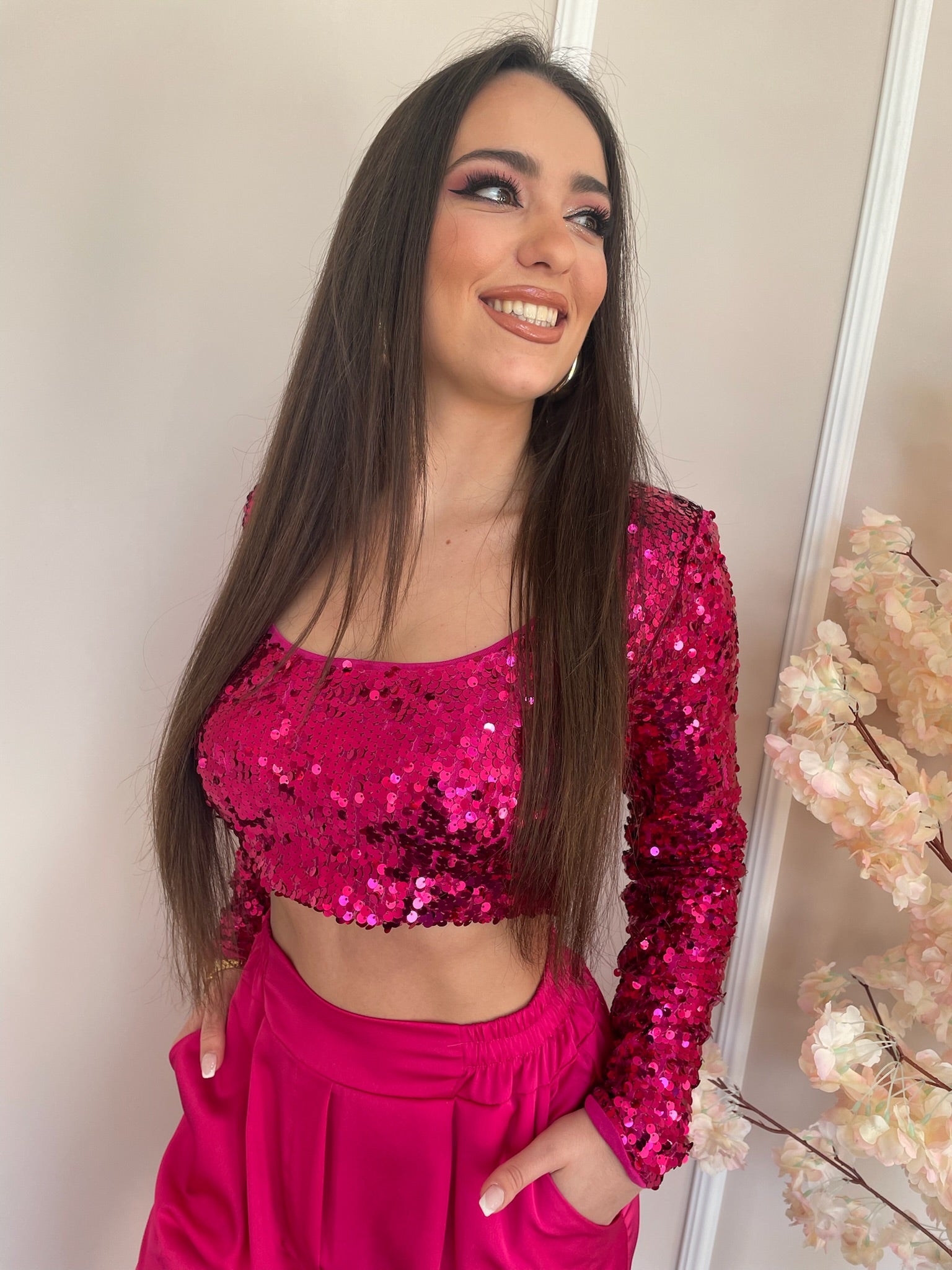 Top de lantejoulas, com manga comprida.
