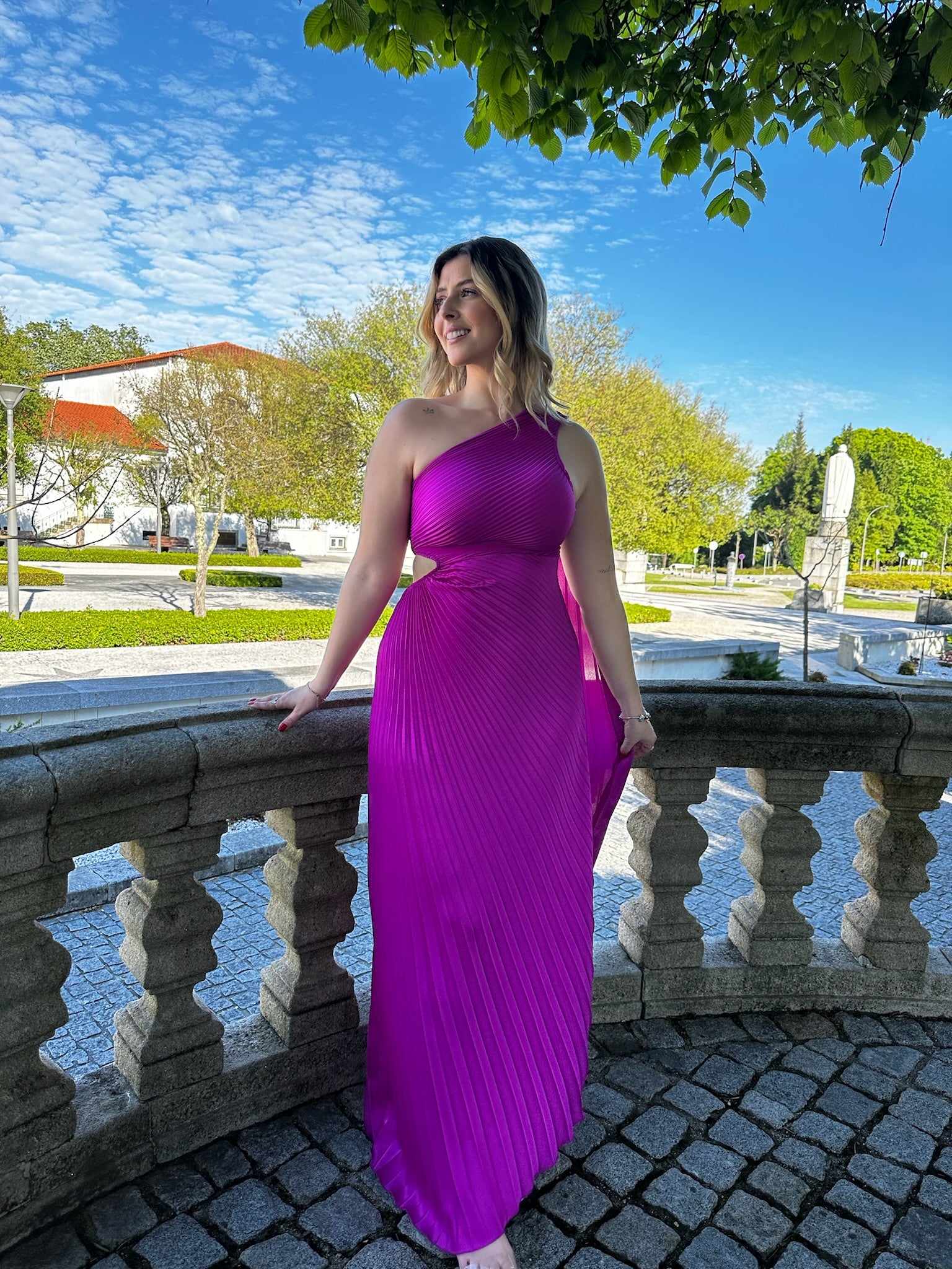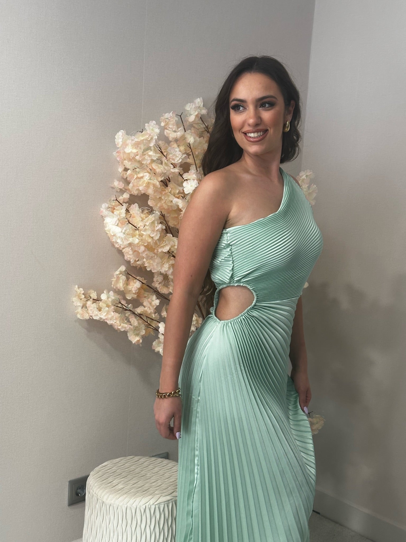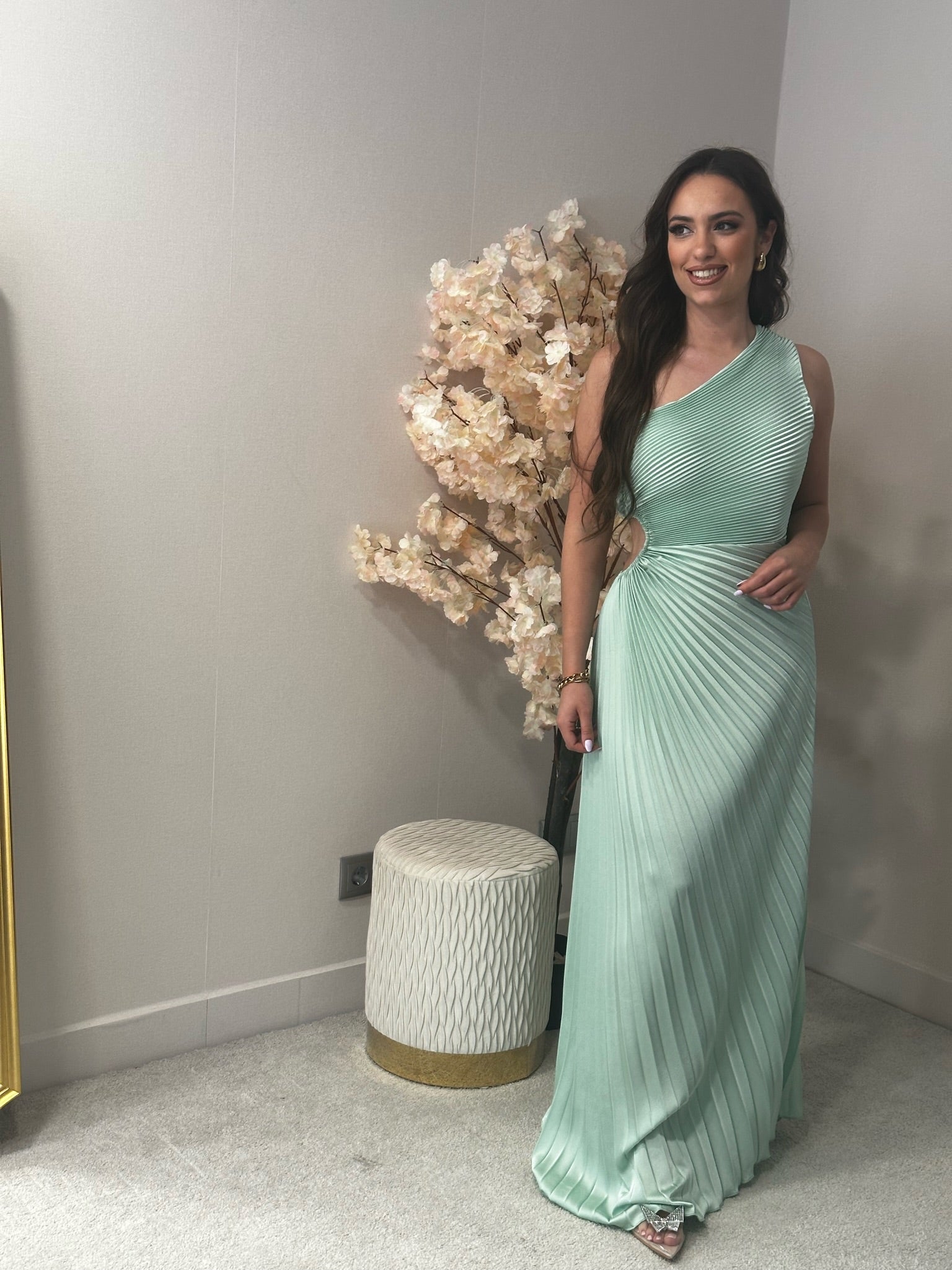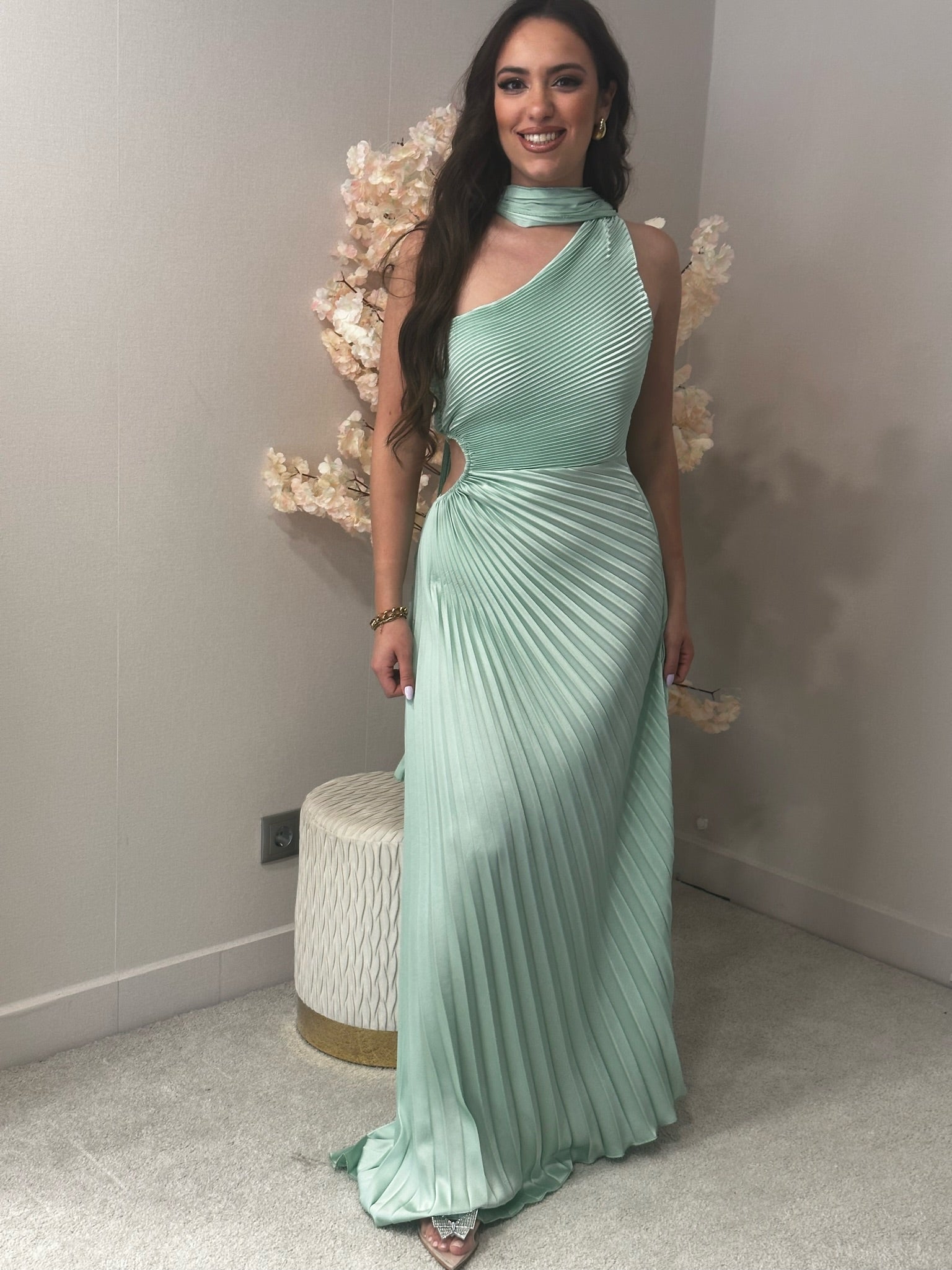 Vestido Cerimónia plissado, acetinado, com abertura de lado.